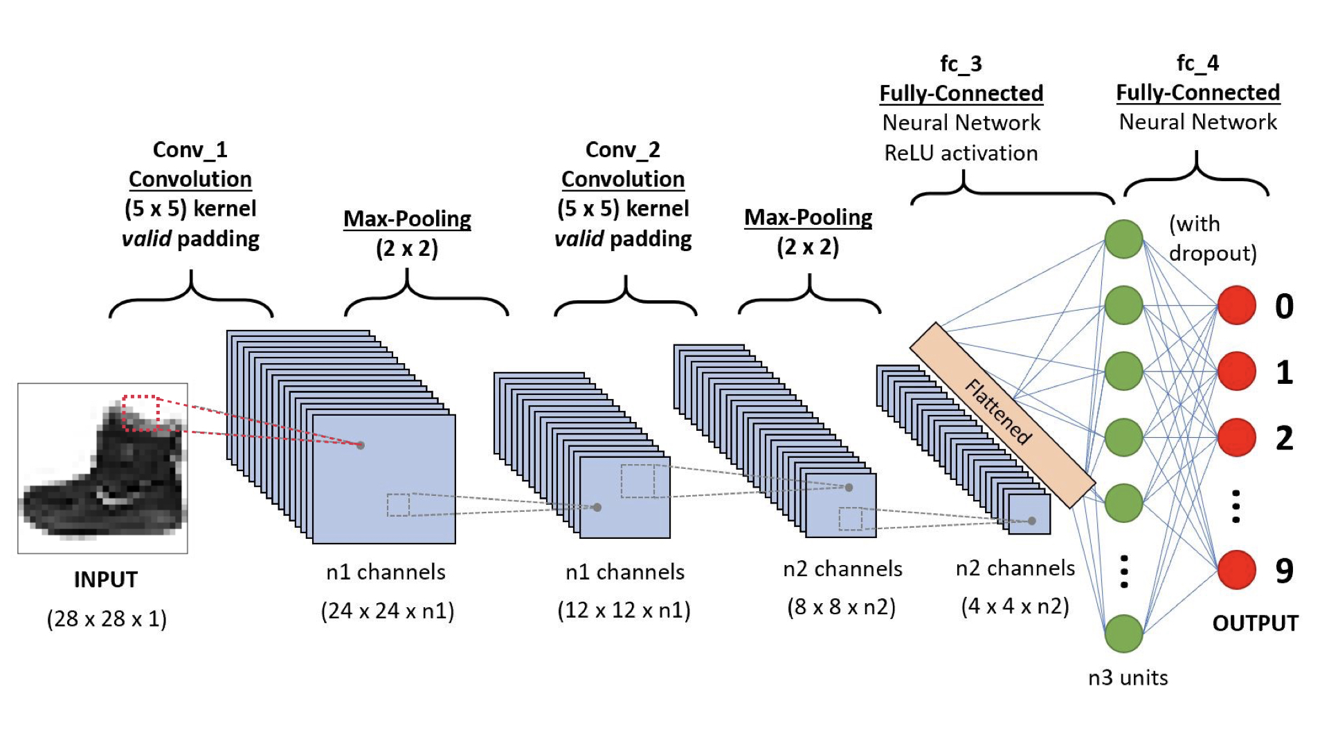 Our CNN contains two convolutional layers, each followed by a max-pooling layer and a batch-normalisation layer, and then a dense layer with dropout and finally the output layer. The network architecture is shown in the following figure (figure source):