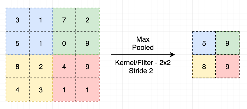 The max-pooling layers are aimed for dimensionality reduction, containing no trainable parameters. It can be easily understood with the following illustration (figure source). The most common size for max pooling is 22.